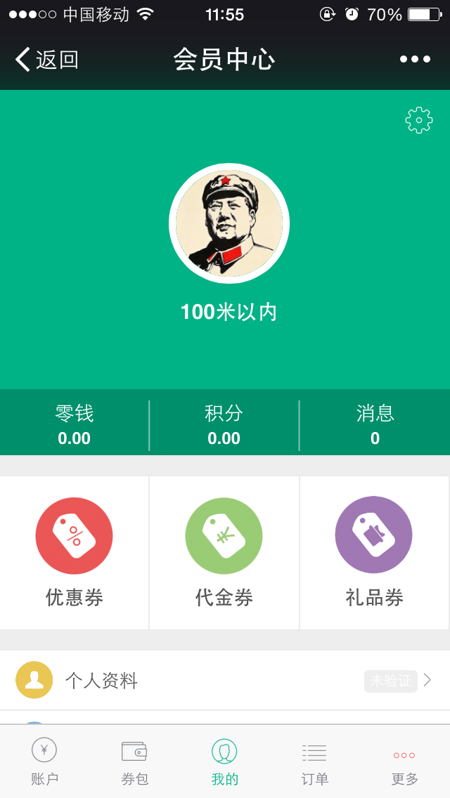 会员中心,是商家所有会员的家,这里集齐了资料,通知、账户、券包等等所有强大的功能。